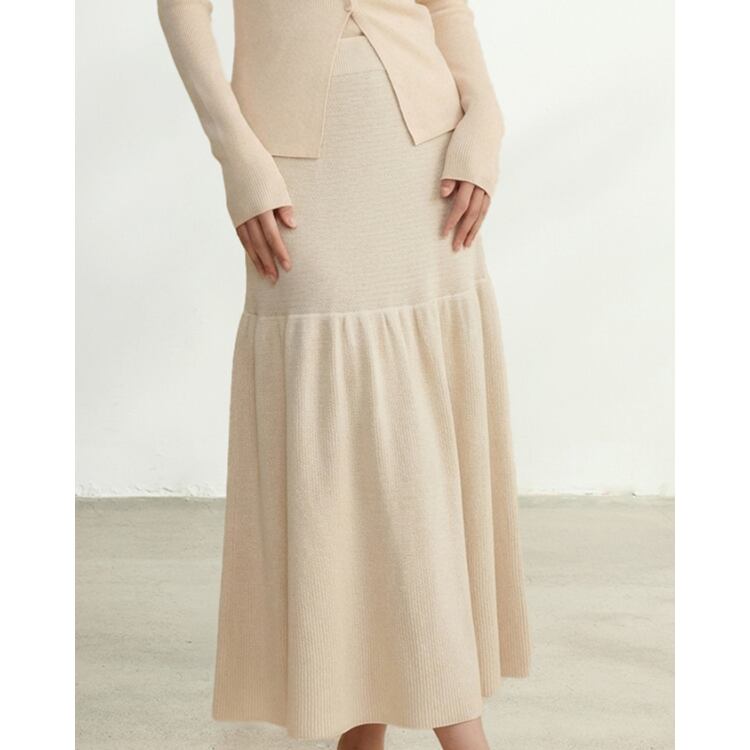 上品な落ち感と軽やかな動きを両立した、リネンブレンドのニットミディスカート。ハイウエスト設計によりウエストラインを自然に引き締め、ヒップ下から切り替えたティアードデザインが立体的なシルエットを形成します。