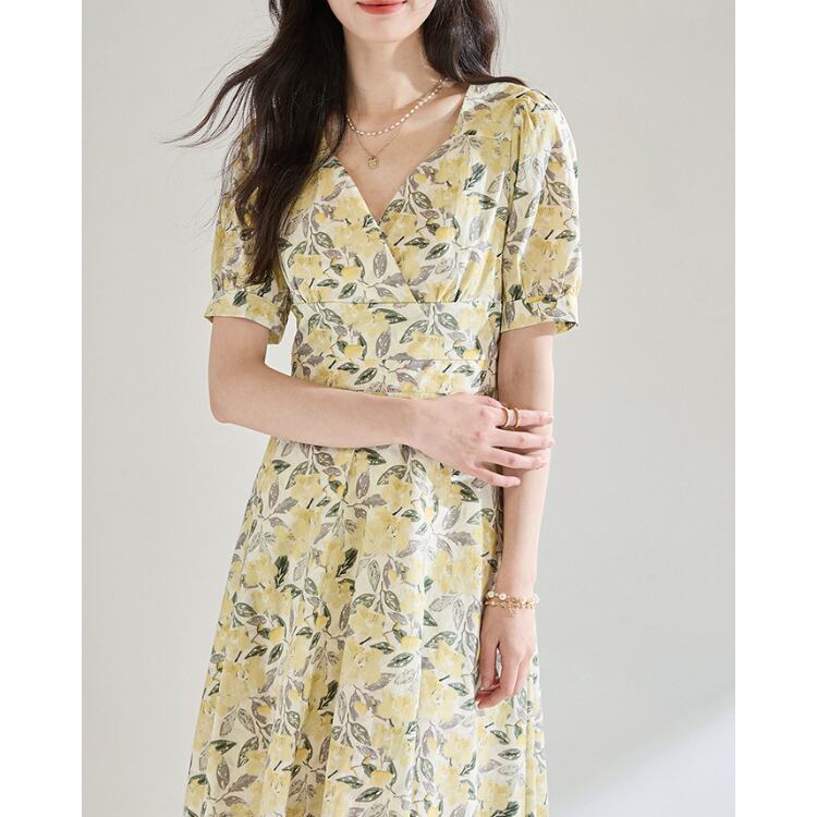 ナチュラルな素材感と繊細なフラワープリントが調和した、サマーシーズンに適したAラインワンピース。ウエスト切替を高めに設定することで、自然なスタイルアップ効果とバランスの取れたシルエットを形成します。