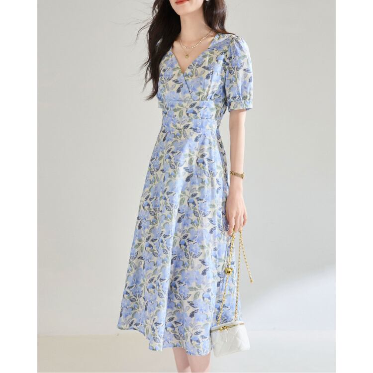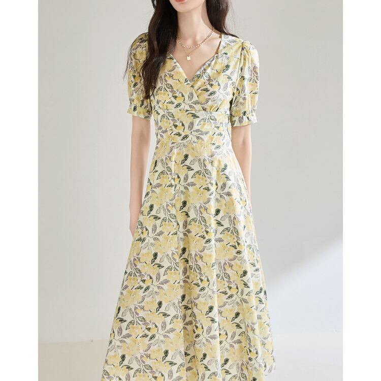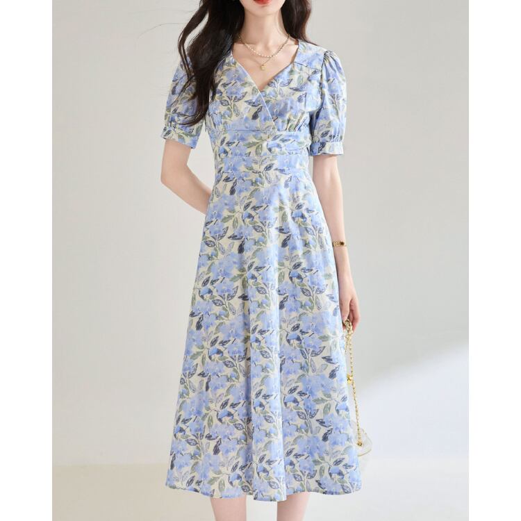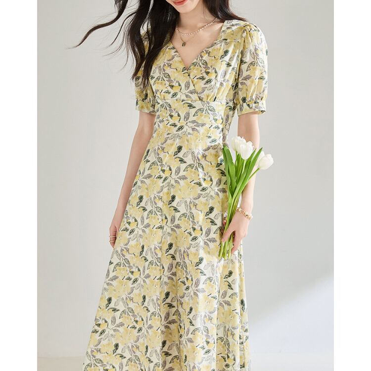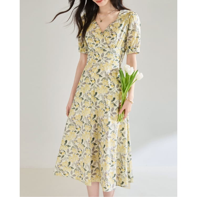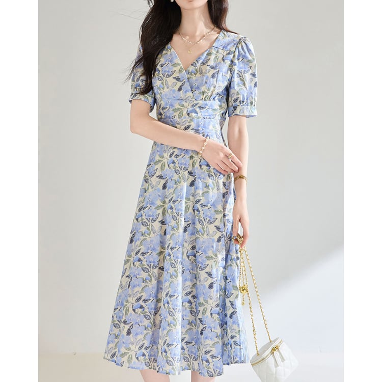 Floral V Neck Puff Sleeve A Line Midi Dress Cotton 2Colors 2603045