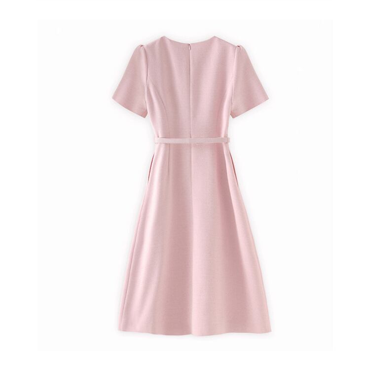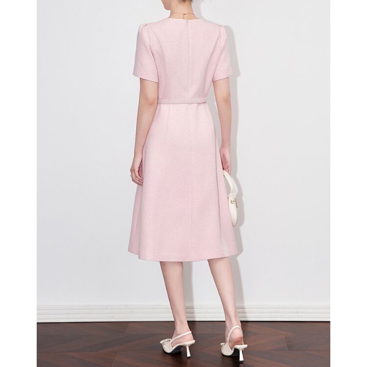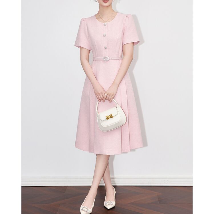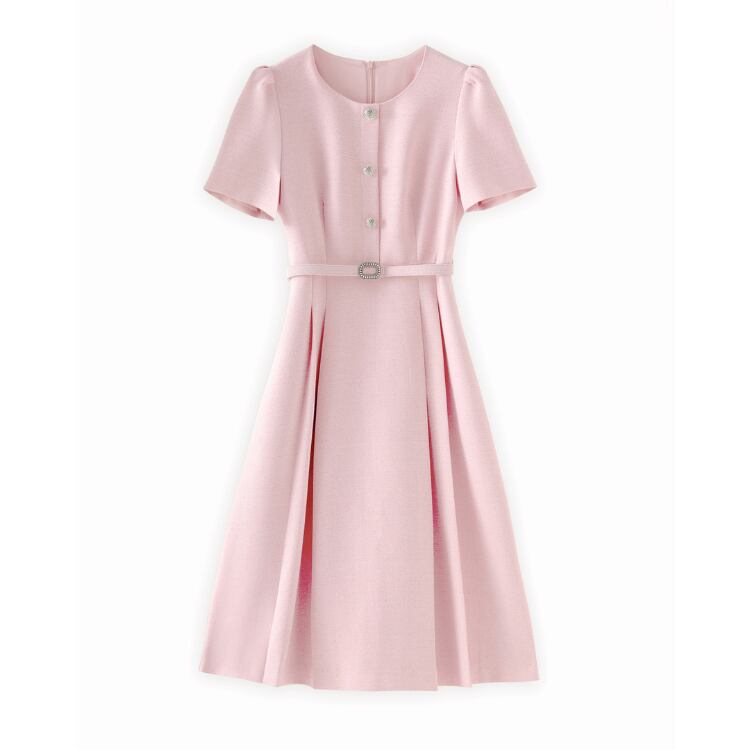 Round Neck Button A Line Midi Dress Belted Short Sleeve 2Colors 2603046