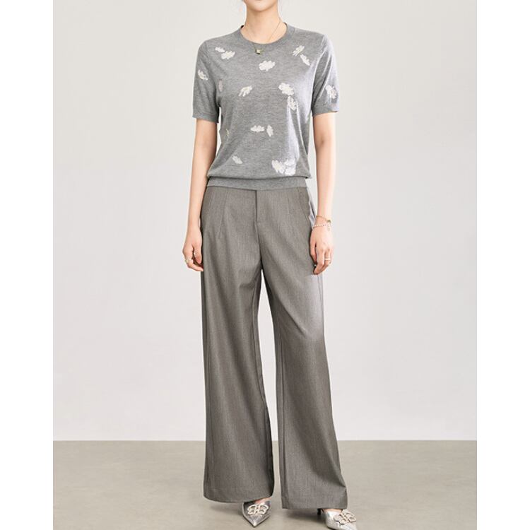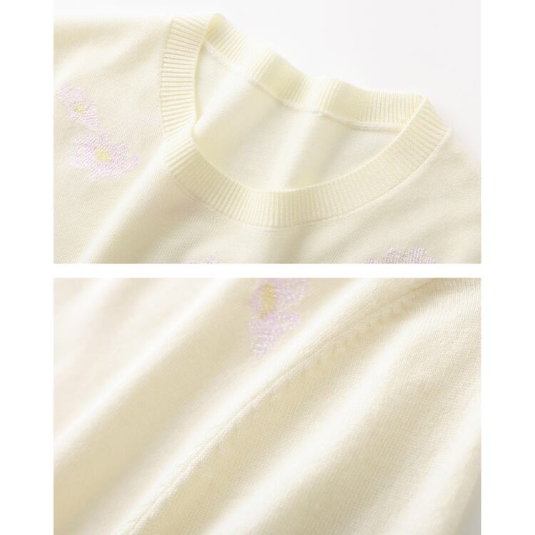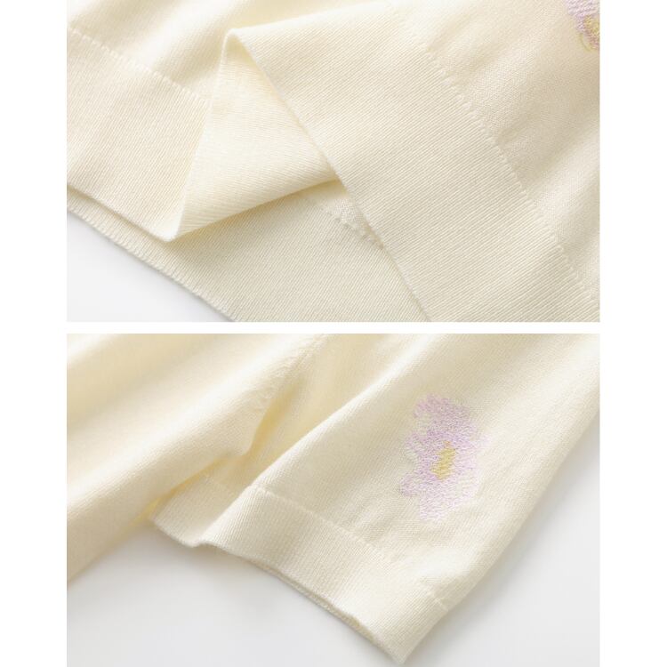 細番手の糸で編み上げたハイゲージニットをベースに、フロント全体へ小花刺繍を散りばめた半袖トップス。柄は主張しすぎない配置で、面としてのニュアンスを保ちながら立体感を付加しています。編地は16ゲージ相当の高密度仕様で、表面は滑らかかつ均一。微細な光沢があり、軽やかな見え方に仕上がっています。