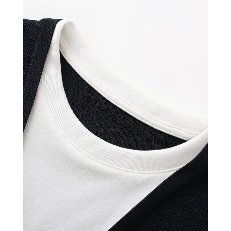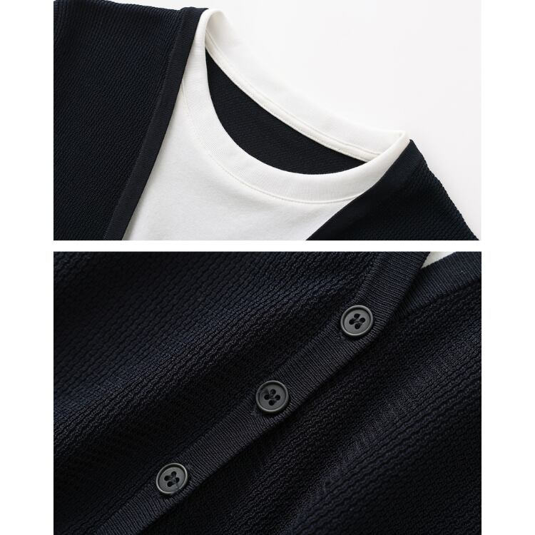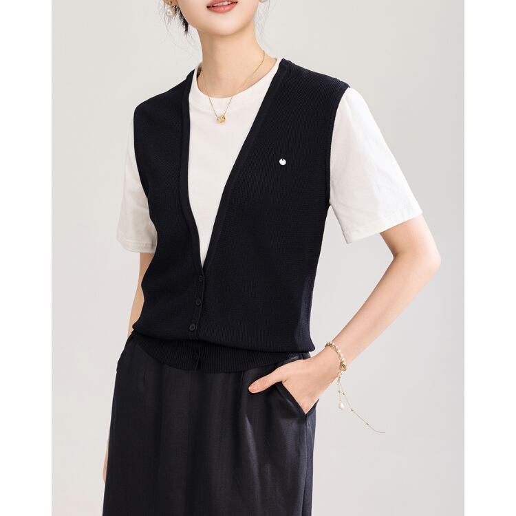 16ゲージの高密度フラット編みで構成されたノースリーブニットベスト。表面は均一で滑らか、細番手ならではの繊細な面構えが特徴です。装飾を抑えたミニマルな設計により、素材の質感と編地の精度が際立つ仕上がりです。