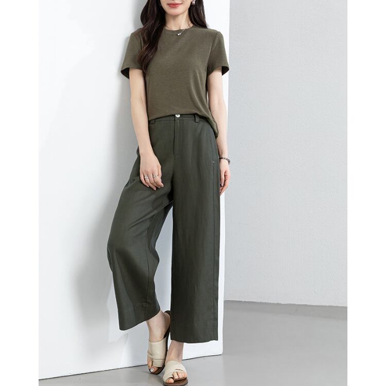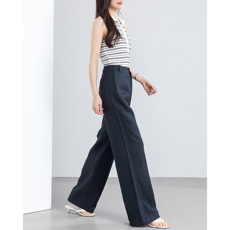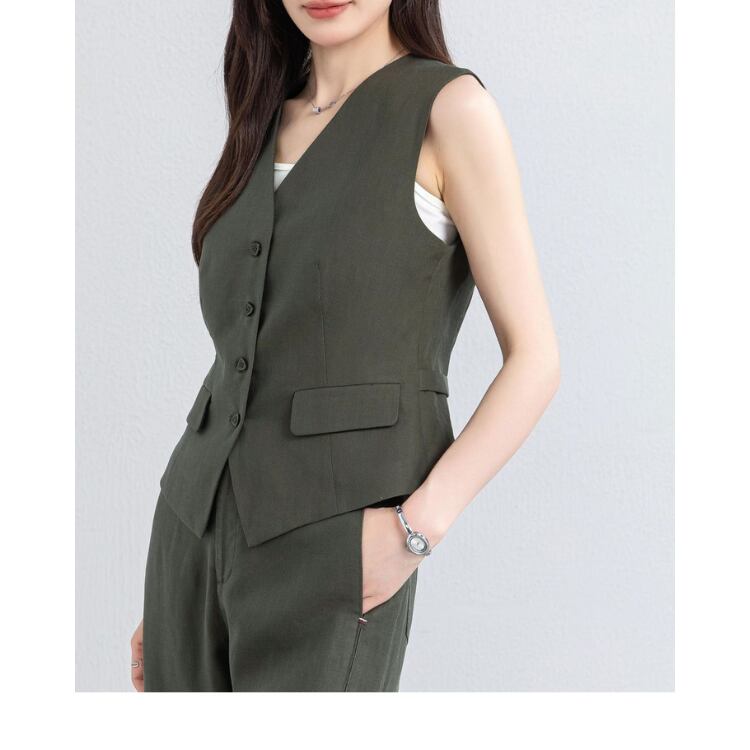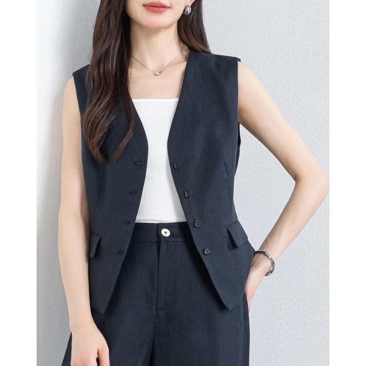 ナチュラルな風合いを持つリネンブレンド素材で構成された、ベスト×ワイドパンツのセットアップ。ドライなタッチと通気性のバランスにより、気温の高いシーズンでも快適な着用環境を確保します。