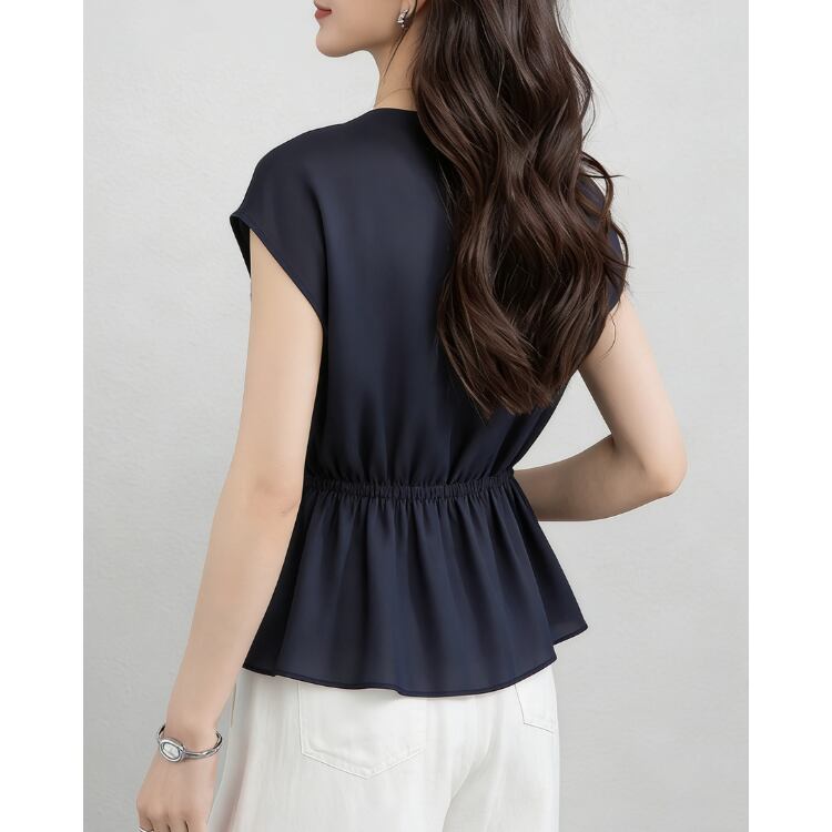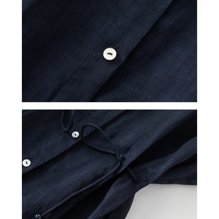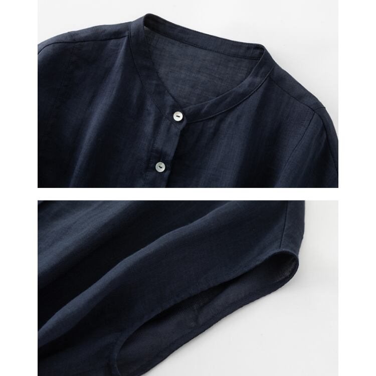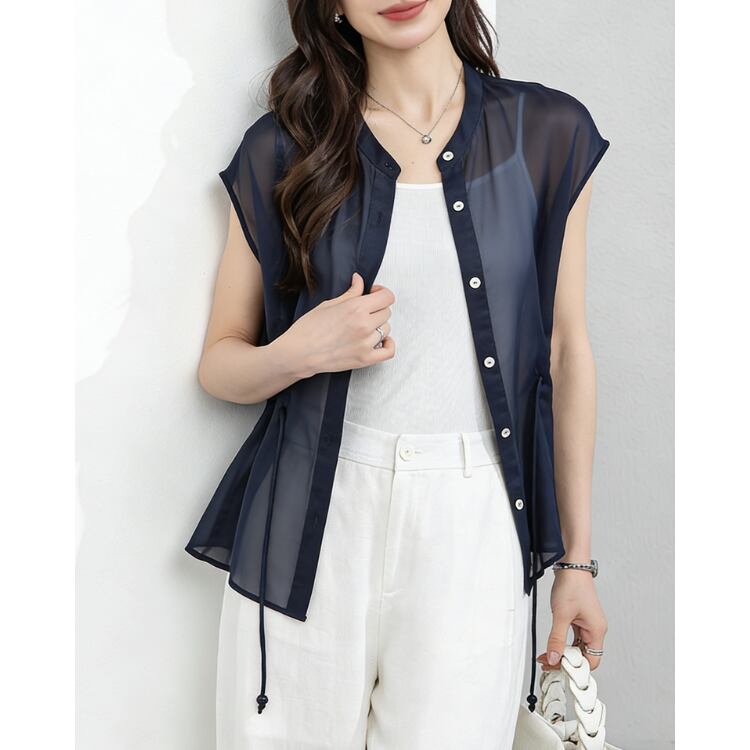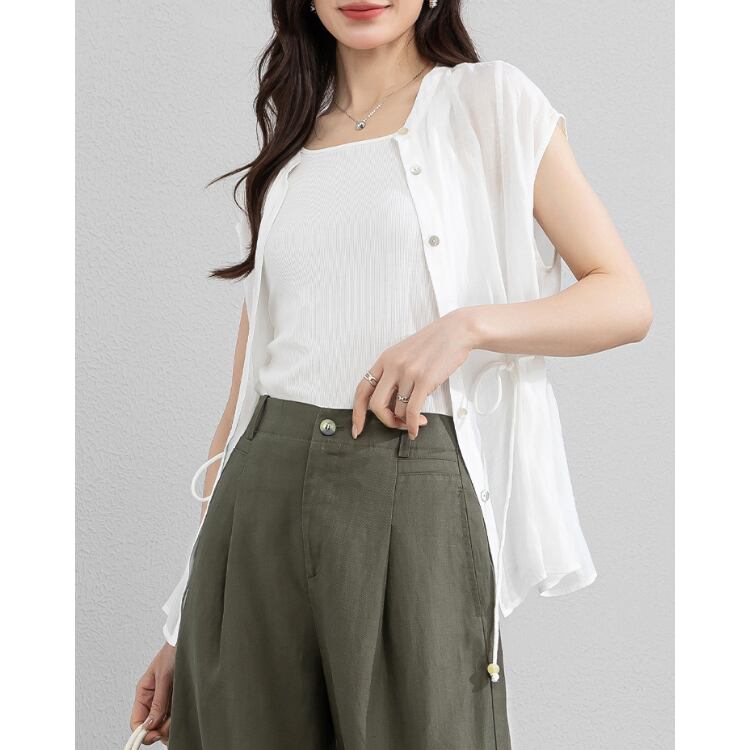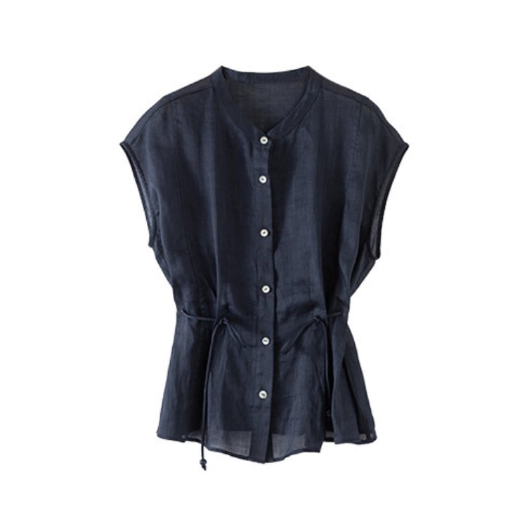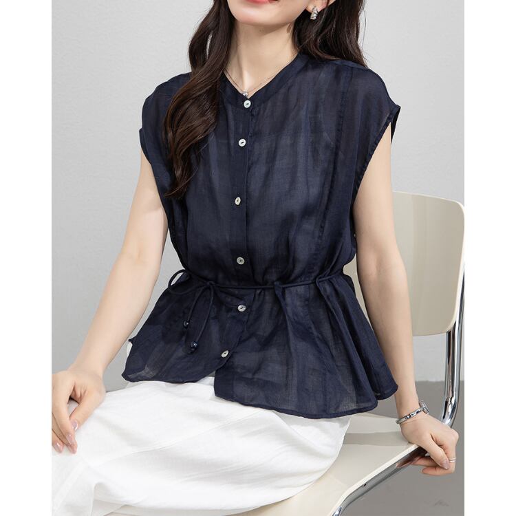 Linen Sleeveless Stand Collar Drawstring Blouse Lightweight 2Colors 2604034
