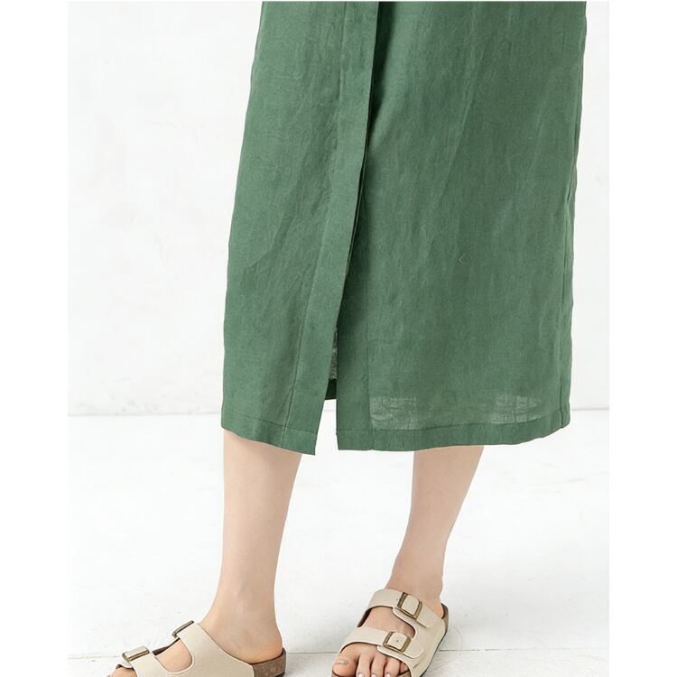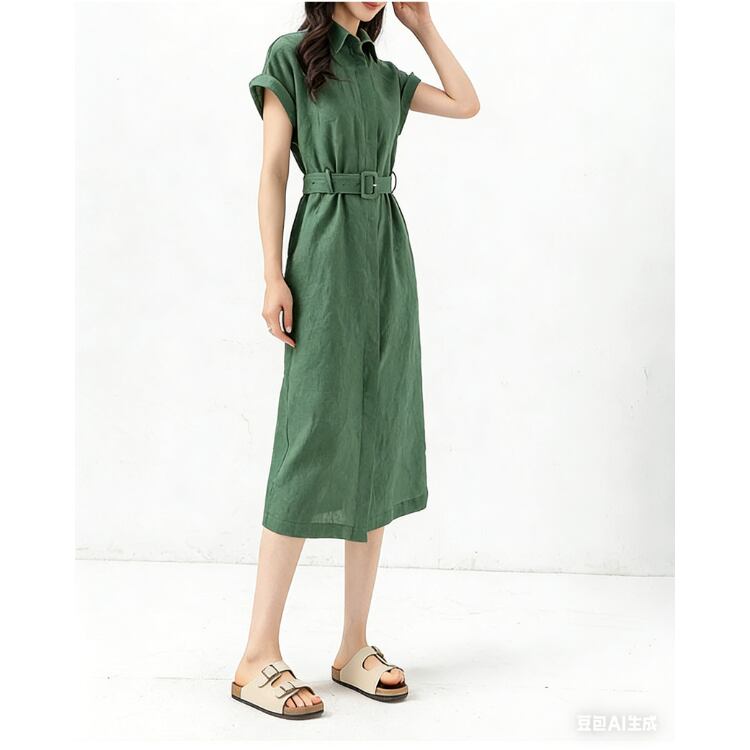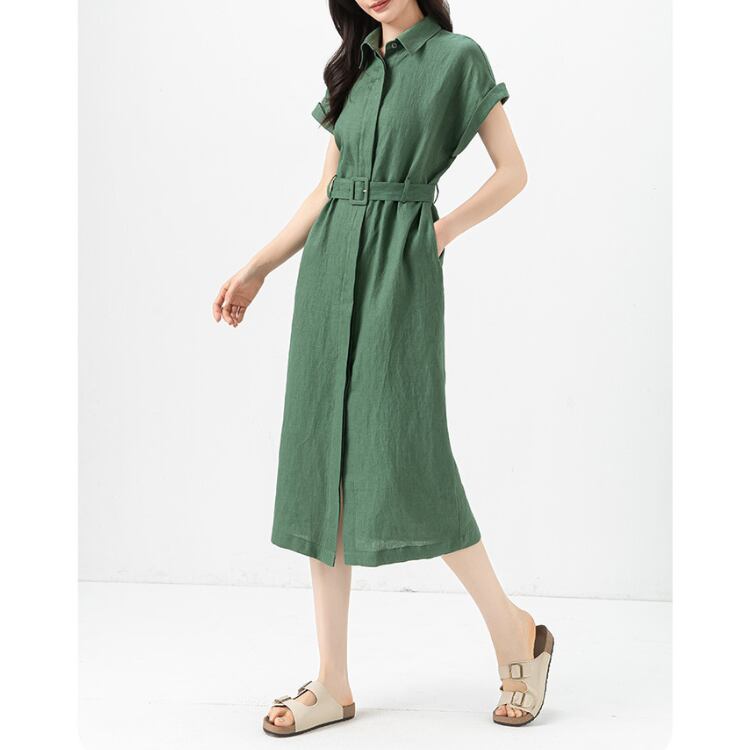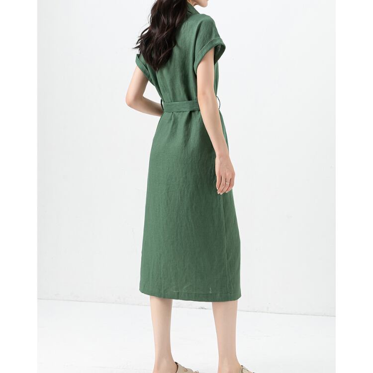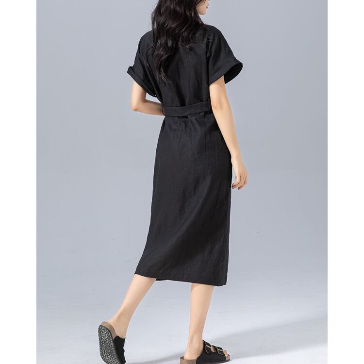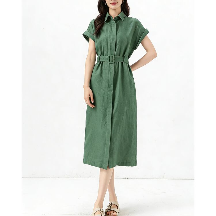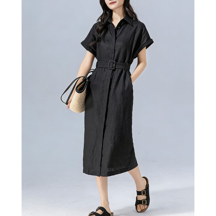 Linen Shirt Dress Belted Midi Relax Fit Summer 2Colors 2604036
