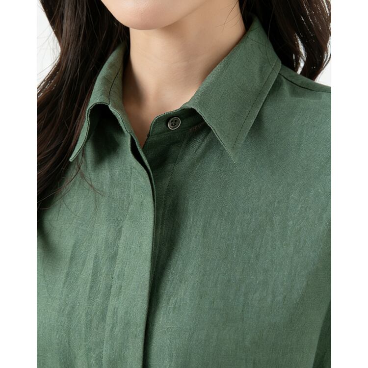 リネン素材をベースにした、軽量で通気性に優れたシャツワンピース。ドライな質感と自然なシワ感が特徴で、日常使いに適した実用性の高い一着です。