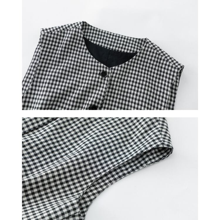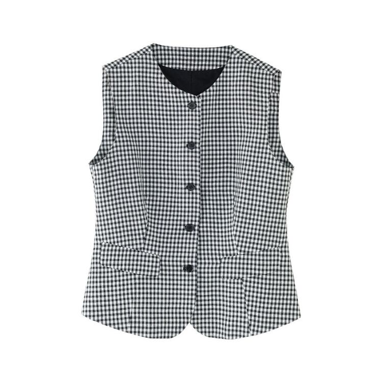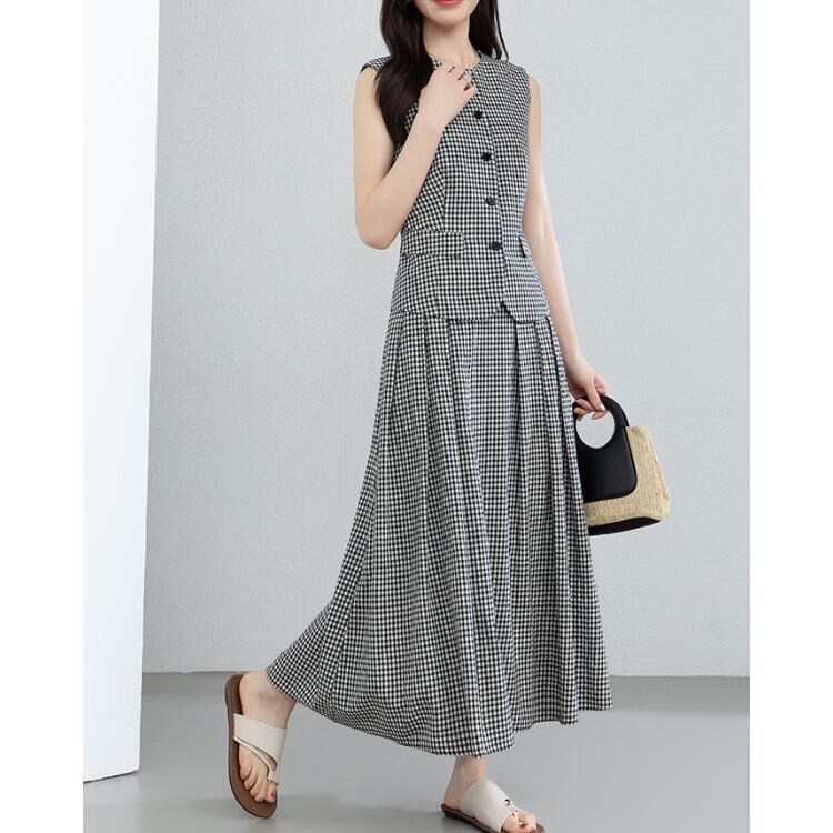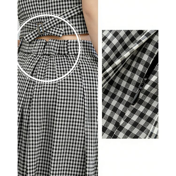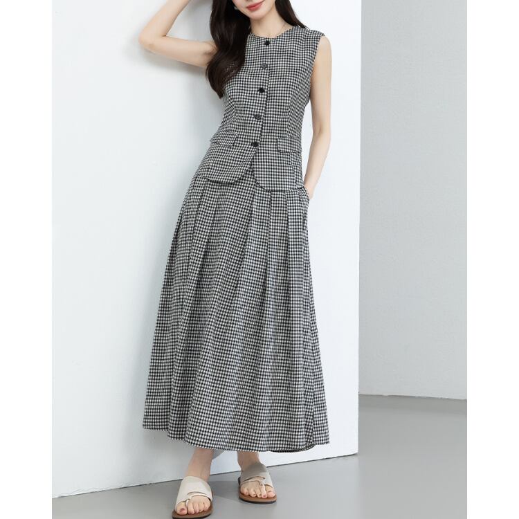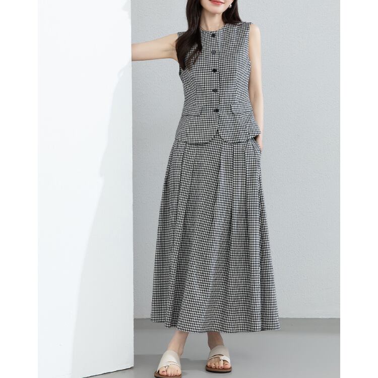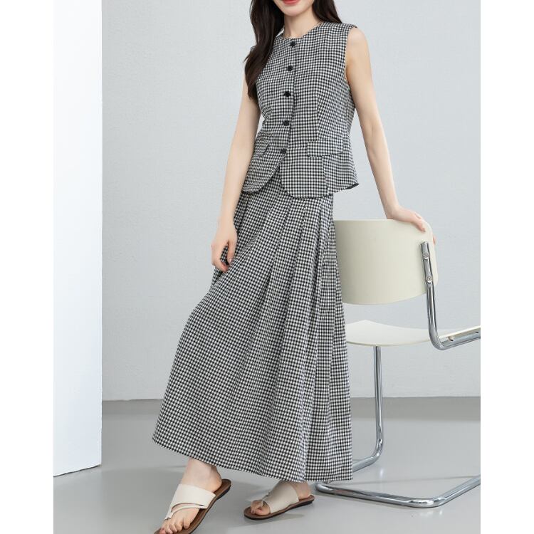 Checkered Vest Midi Skirt Set Vintage Casual 2604037