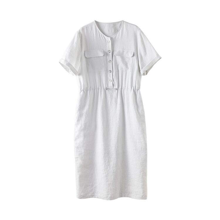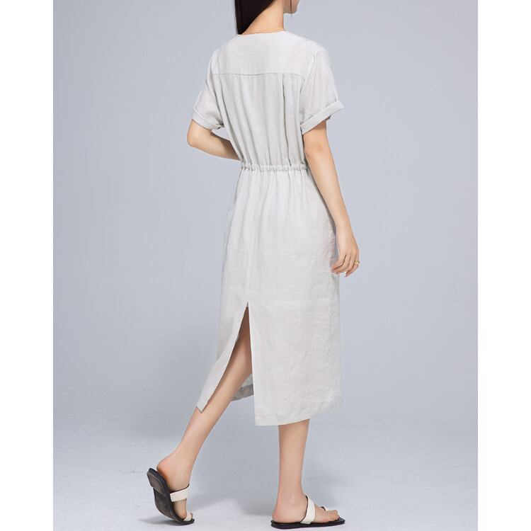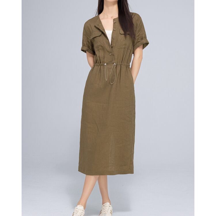Linen Drawstring Waist Midi Dress Relax Fit Summer 2Colors 2604038