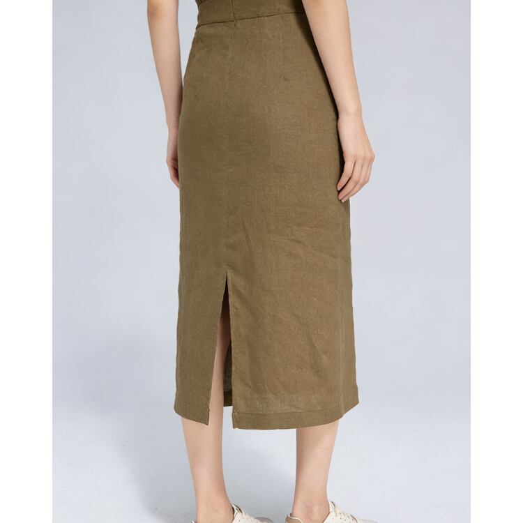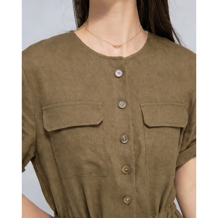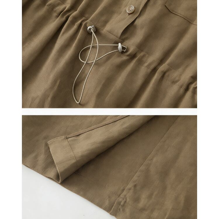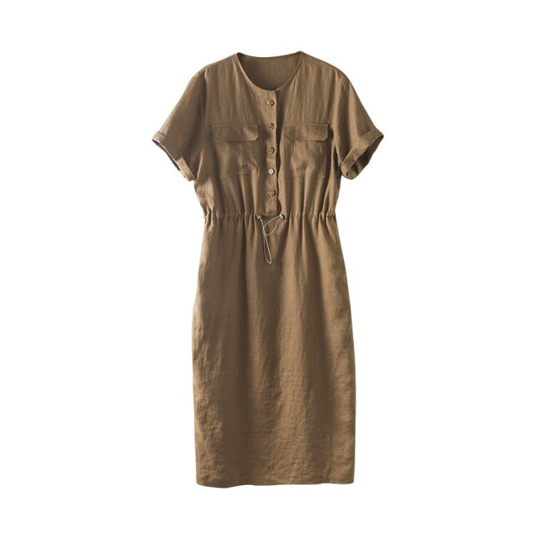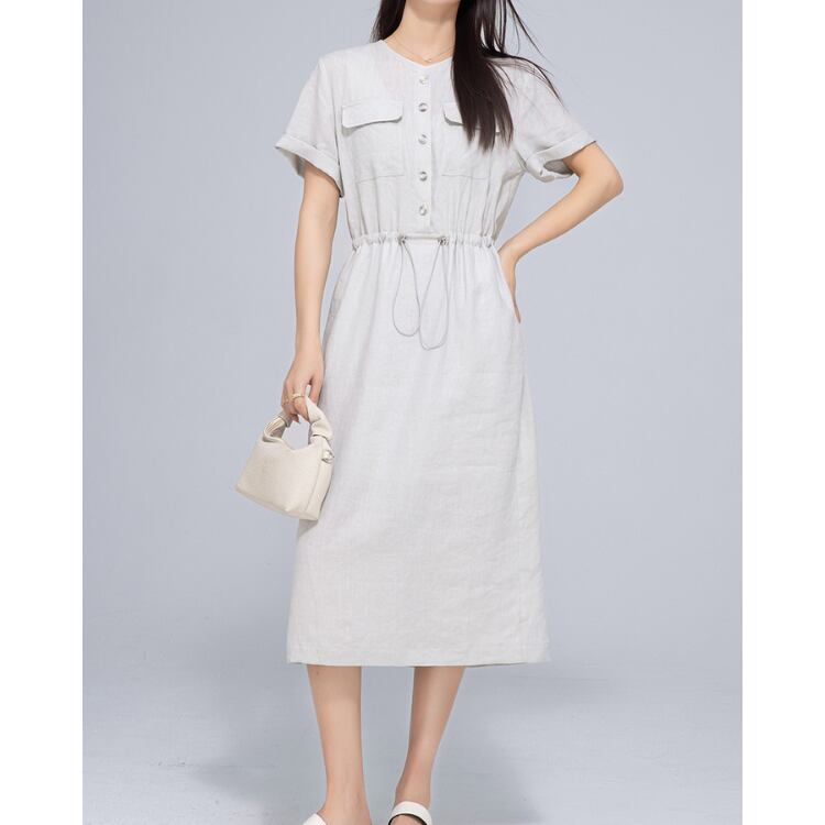 リネン素材を使用した、軽量で通気性に優れたミディ丈ワンピース。ドライなタッチとナチュラルな風合いにより、日常のスタイリングに取り入れやすい設計です。