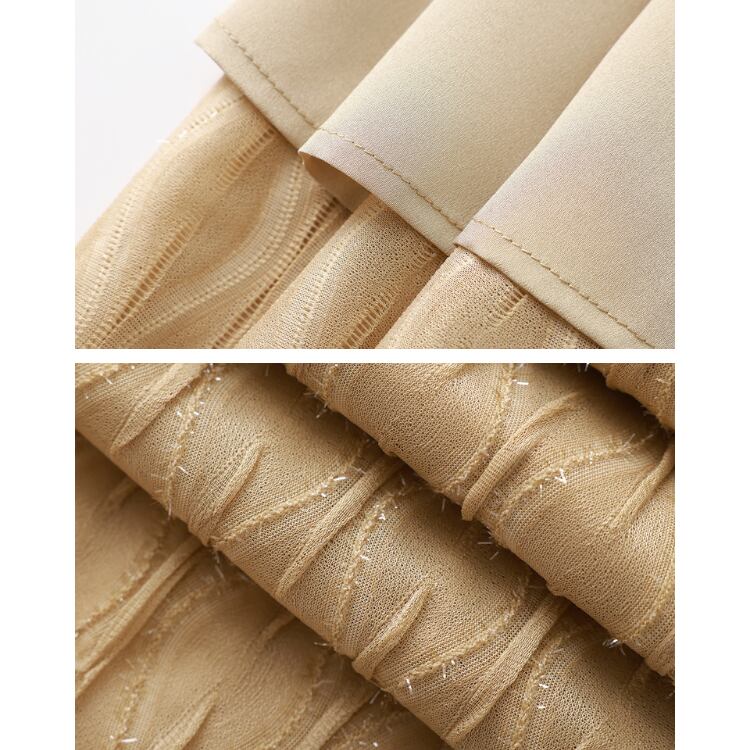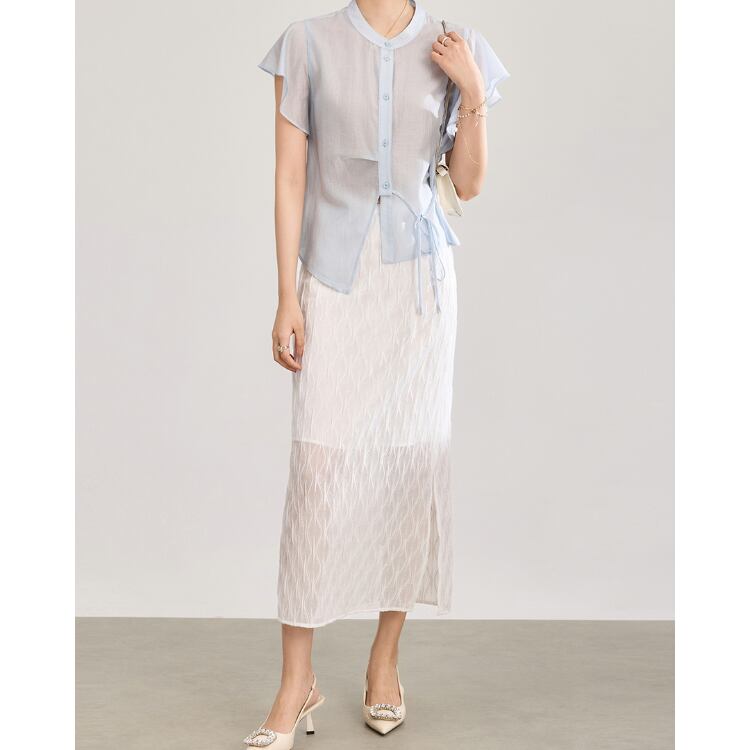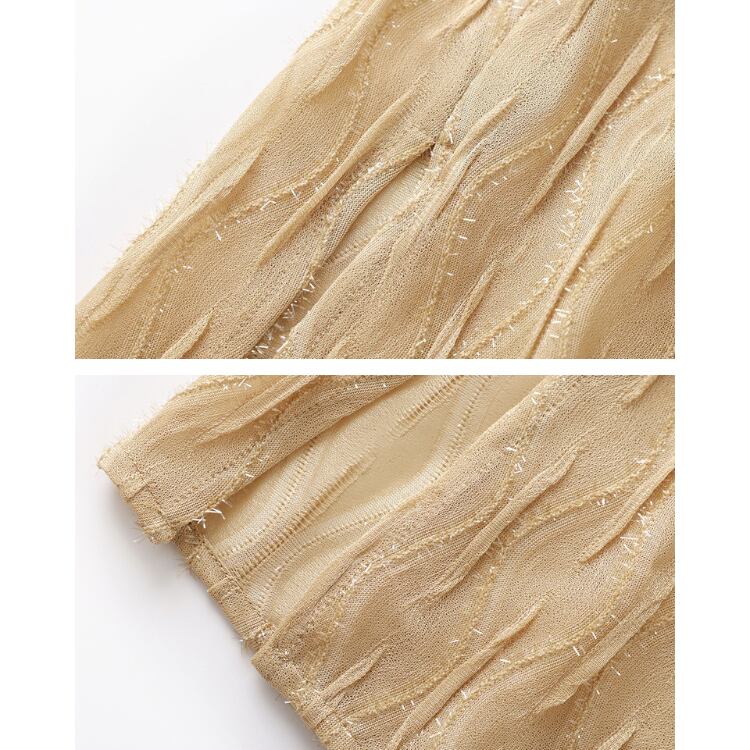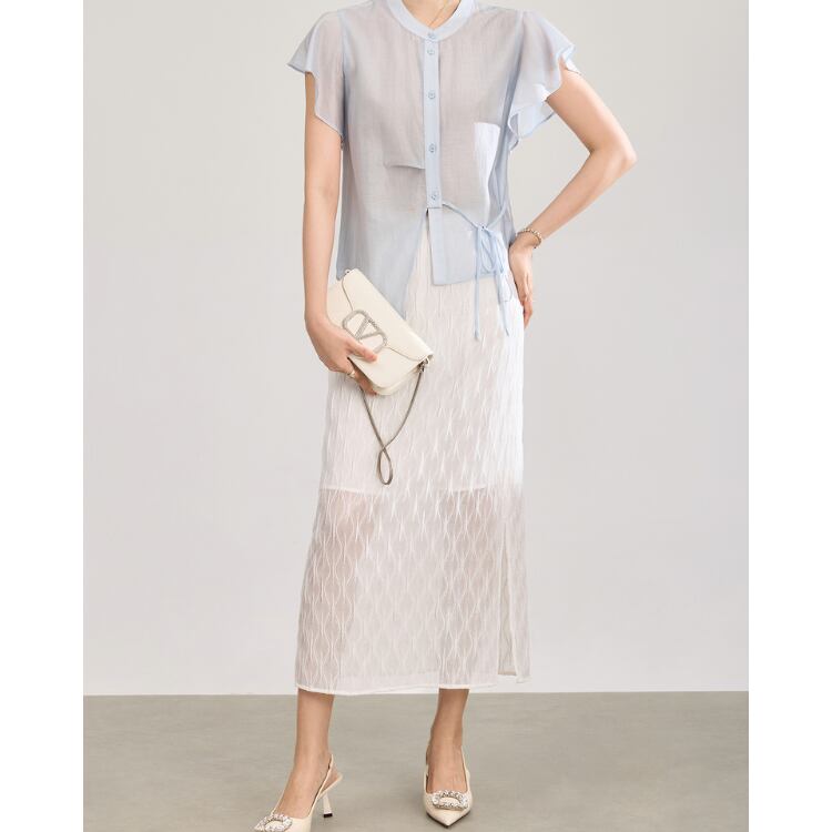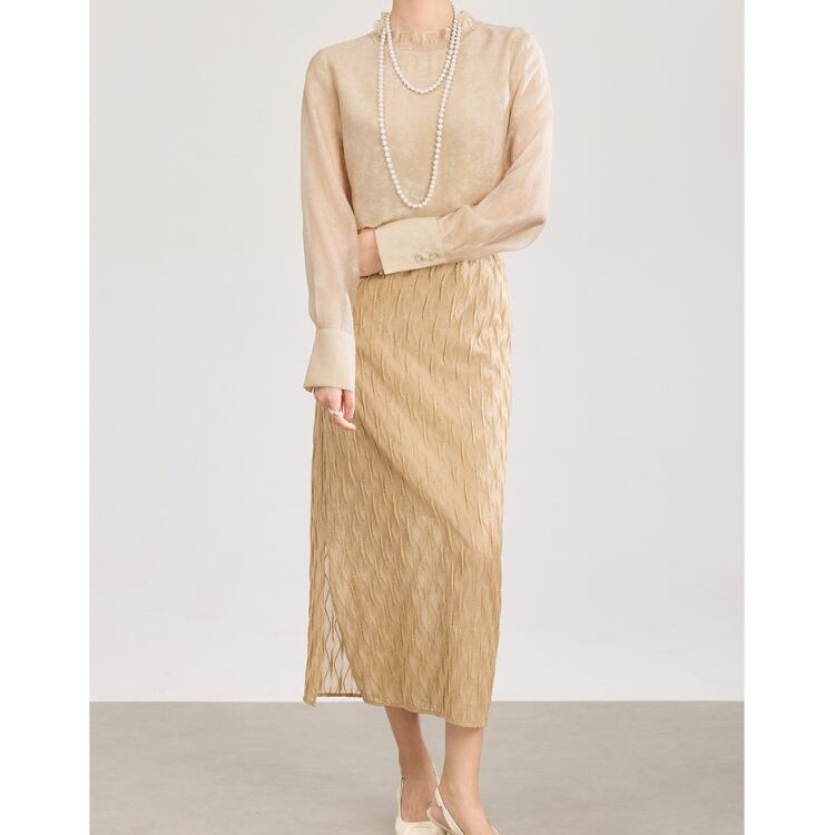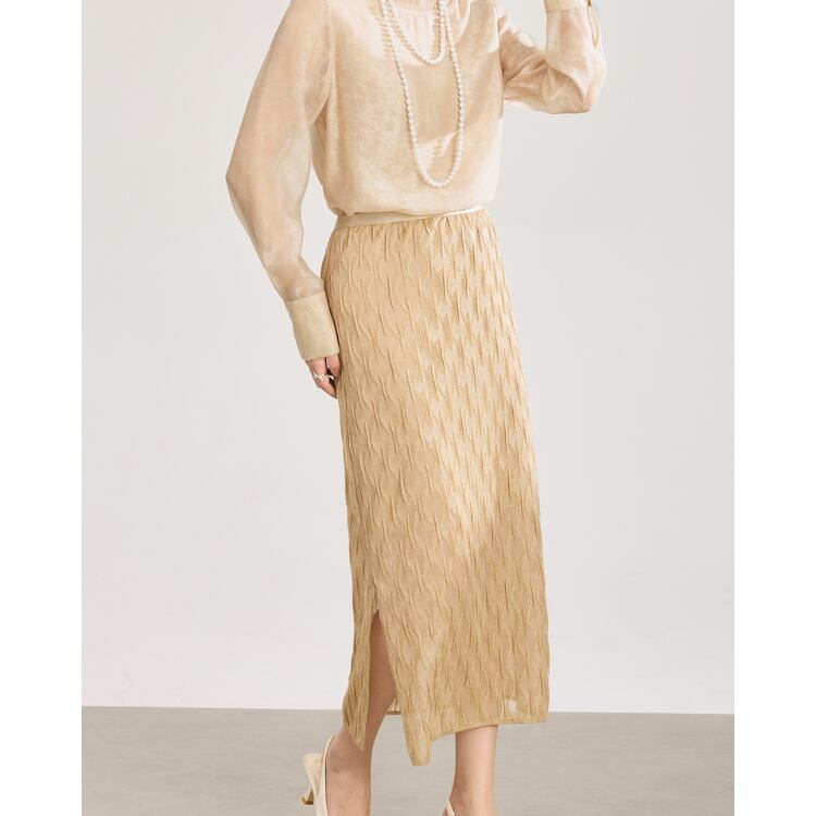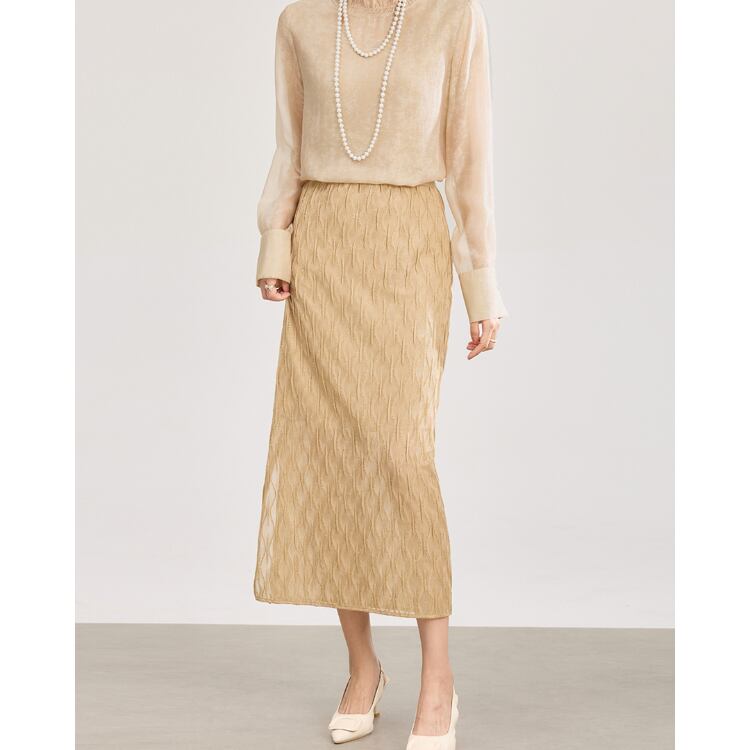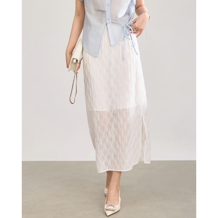繊細な透け感を持つガーゼ調レース素材を使用したミディスカート。表面には立体的な波状パターンを施し、単調にならない奥行きのある表情に仕上げています。