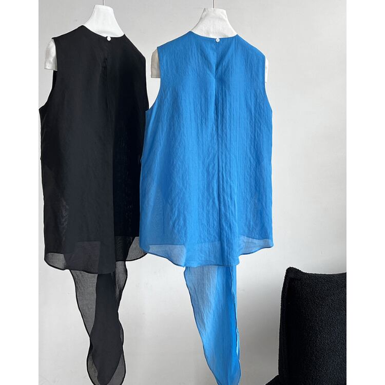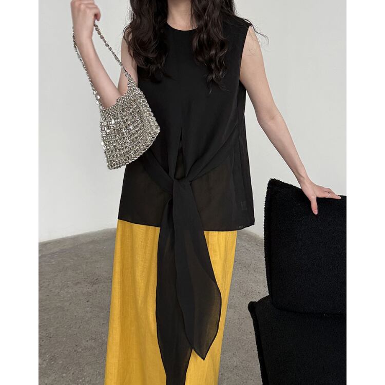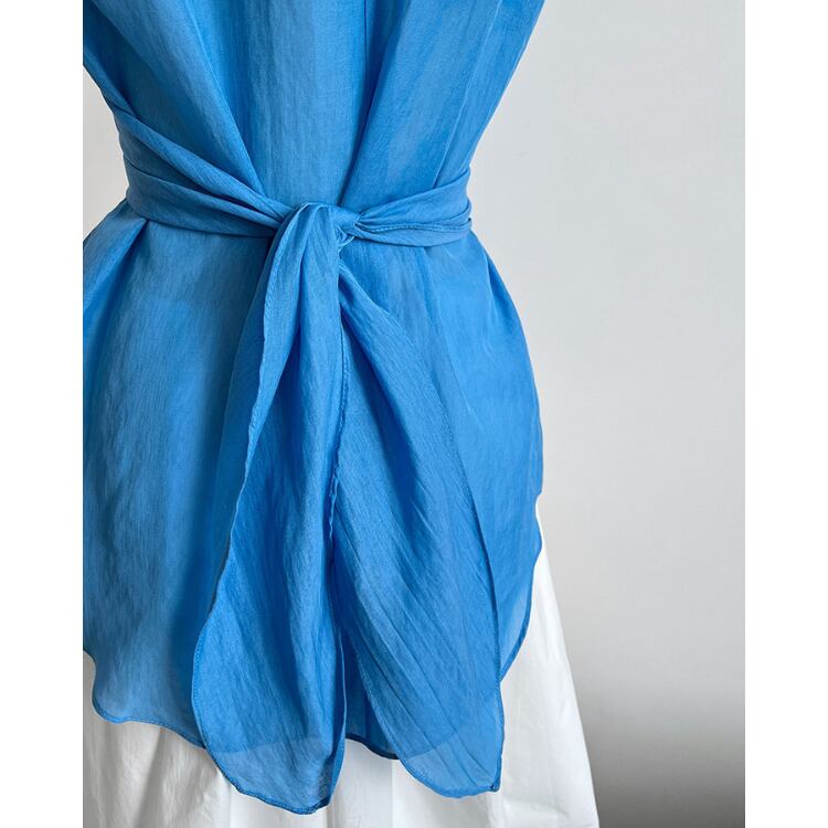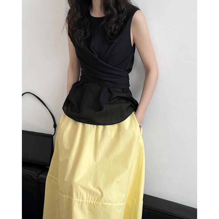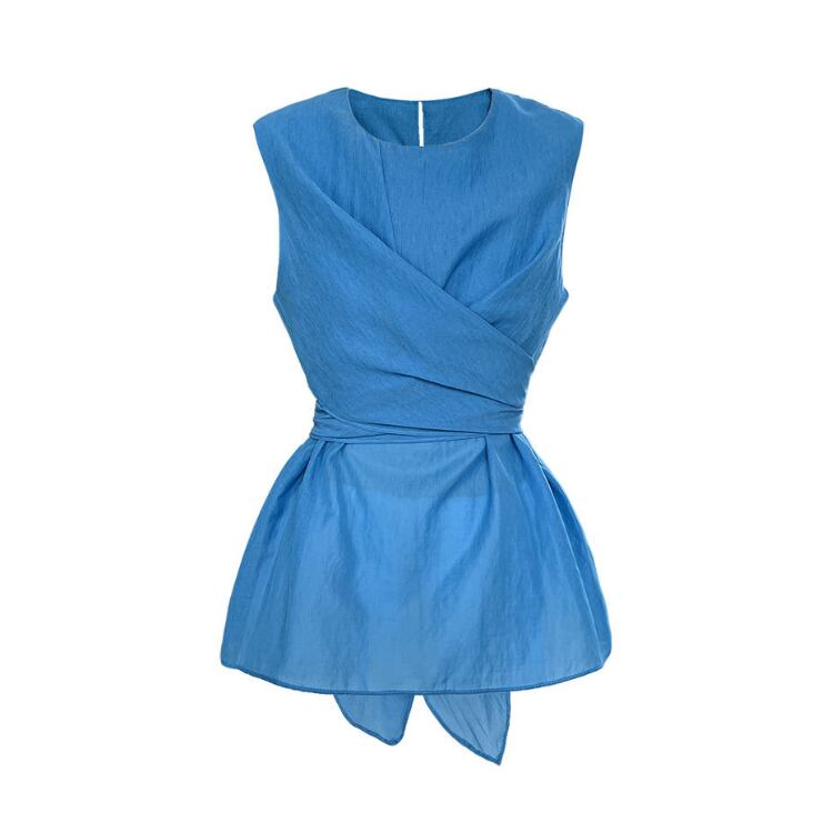 立体的なカシュクールデザインとウエストラップディテールが印象的な、ノースリーブブラウスです。フロントを斜めに重ねた構築的なラインが自然な陰影を生み、シンプルながら存在感のある一着に仕上がっています。