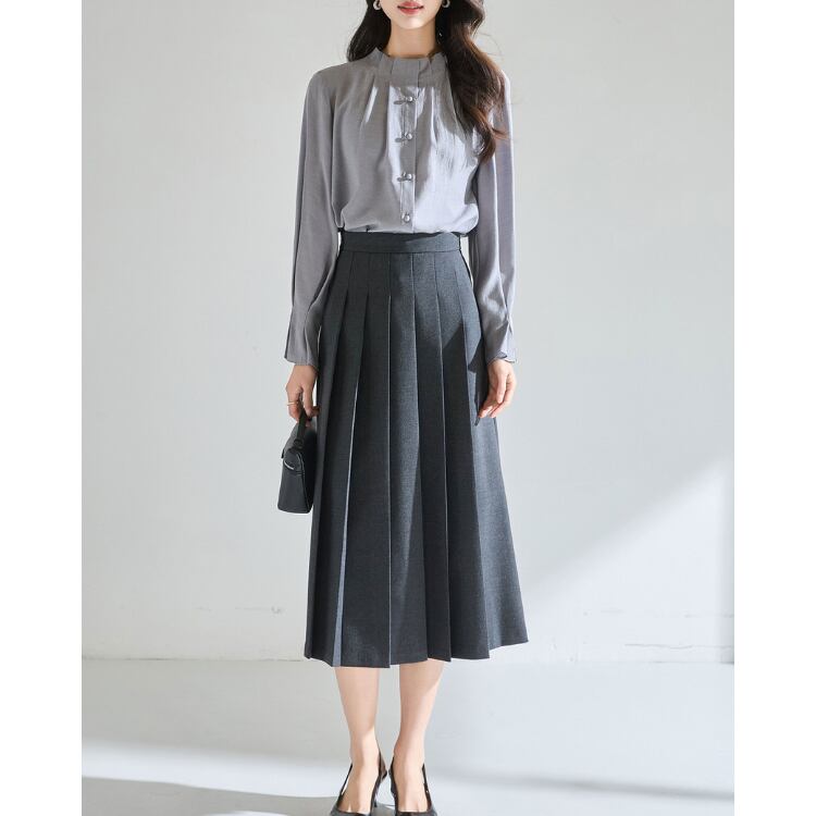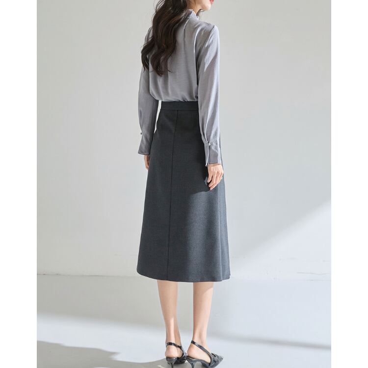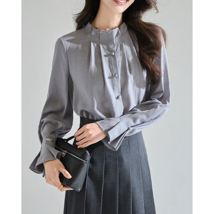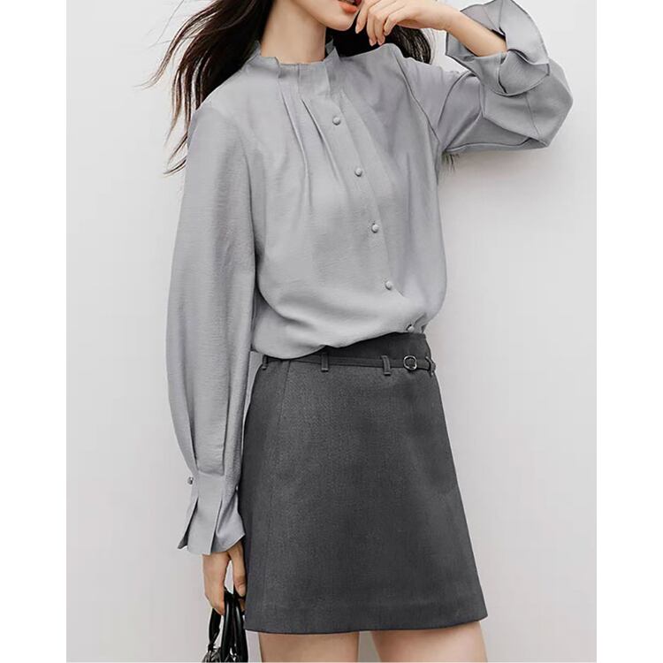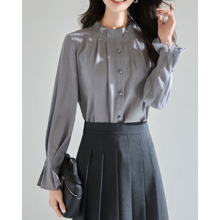 首元にあしらわれたフリル調の木耳ネックデザインが印象的な、クラシックムード漂う長袖ブラウスです。端正なスタンドカラーに柔らかなディテールを加えることで、きちんと感と女性らしさを両立した一着に仕上がっています。