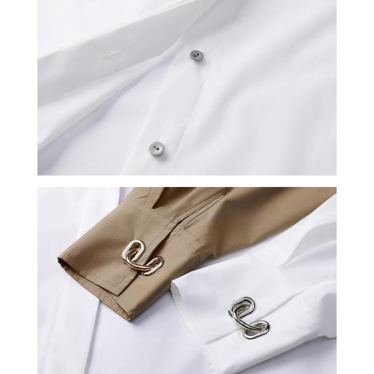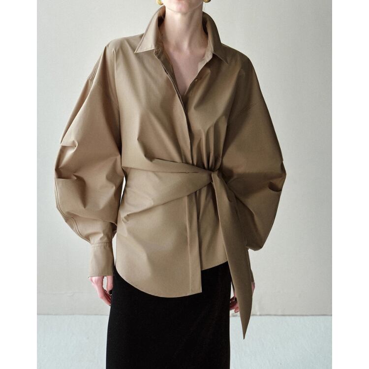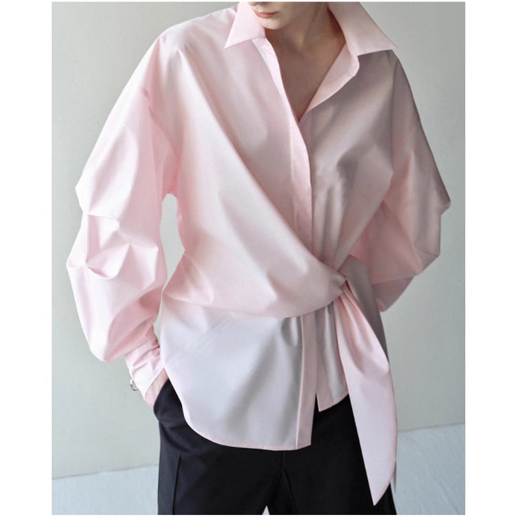 立体的なラップデザインが視線を引き寄せる、モード感漂うオーバーサイズシャツブラウスです。クラシックなシャツカラーをベースに、ウエスト部分へクロスさせた共布ディテールを加えることで、洗練された構築的シルエットに仕上げています。