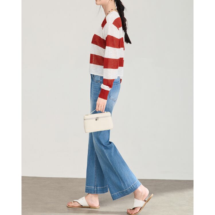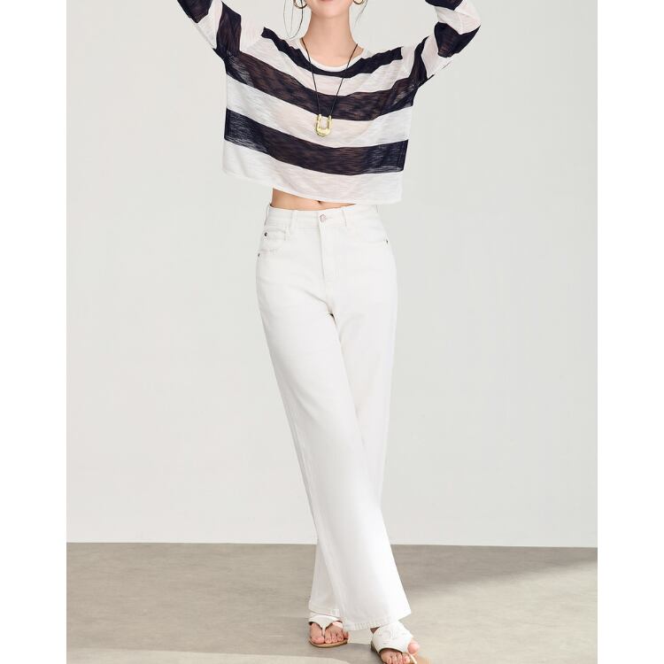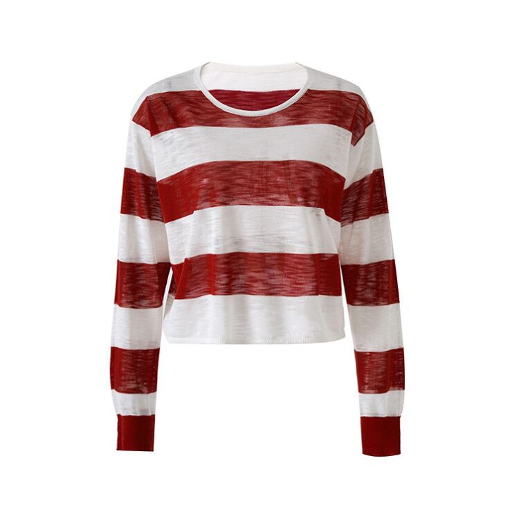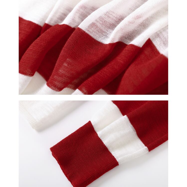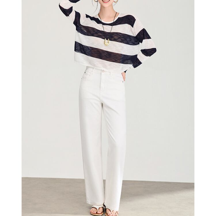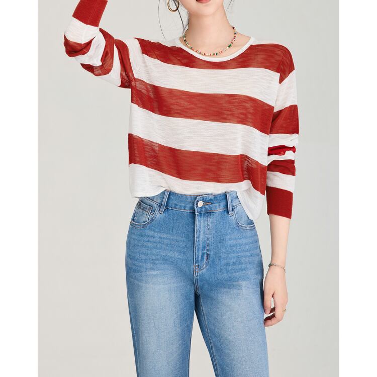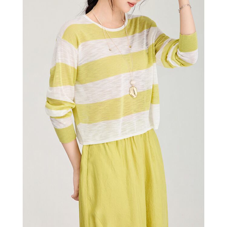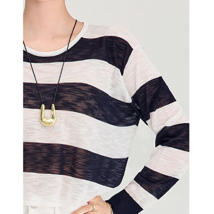 清涼感のある透け編みボーダーデザインが印象的な、長袖ニットトップスです。軽やかな編地とゆとりのあるシルエットにより、暑い季節でも快適に着用しやすい一着です。