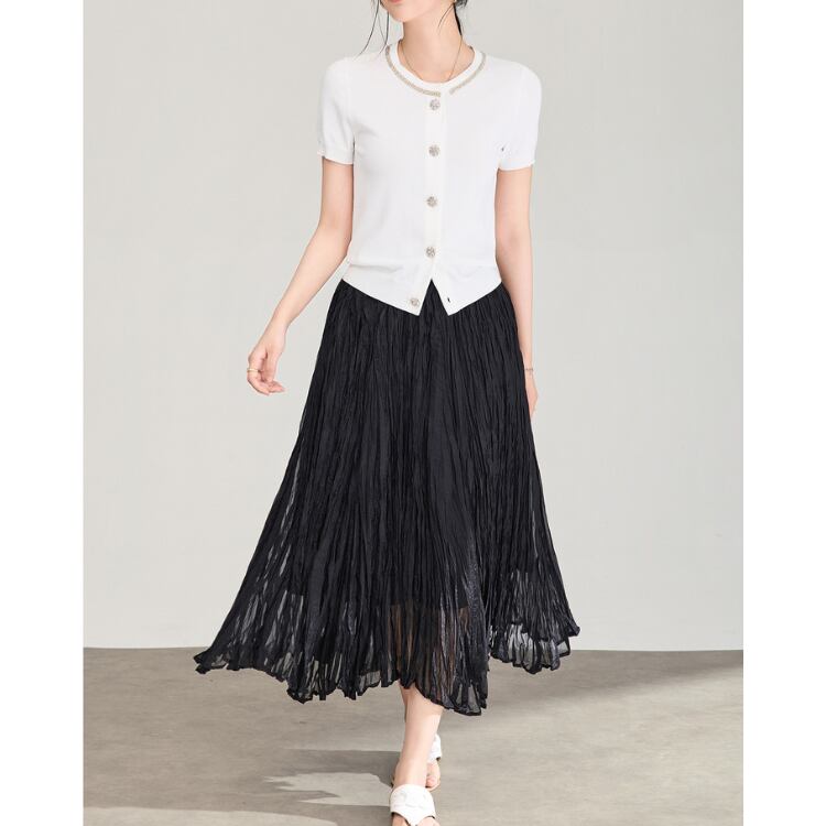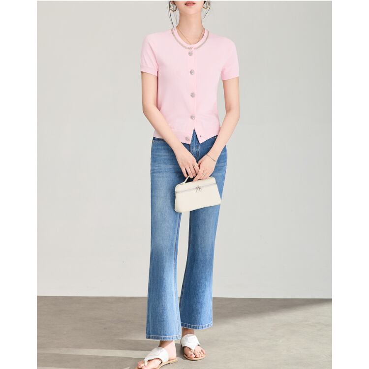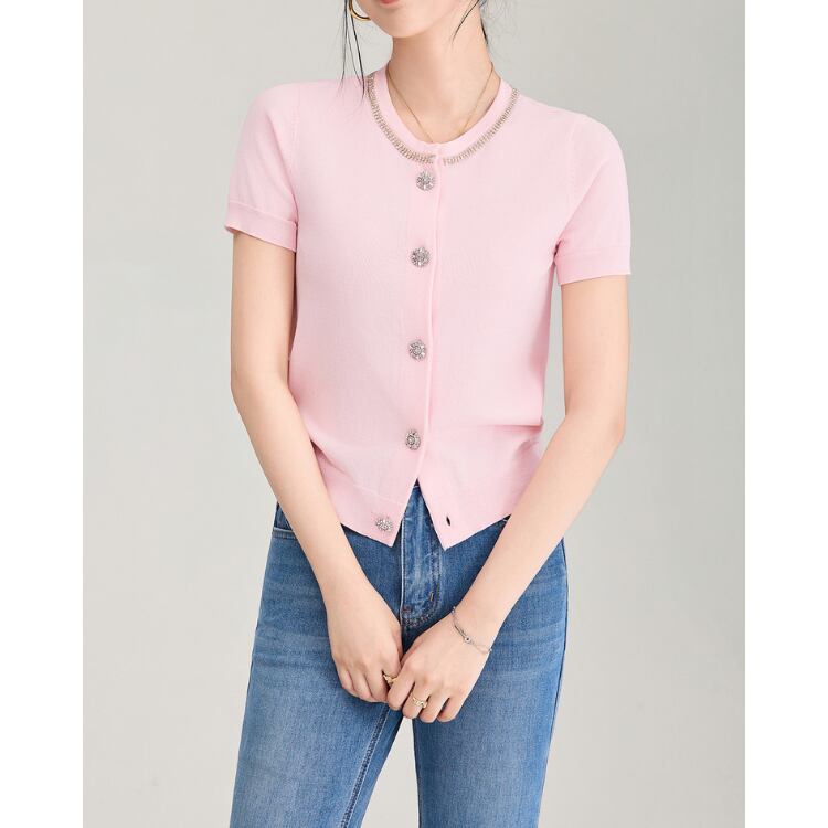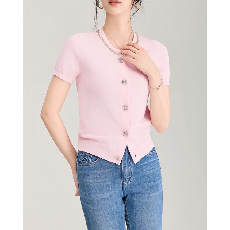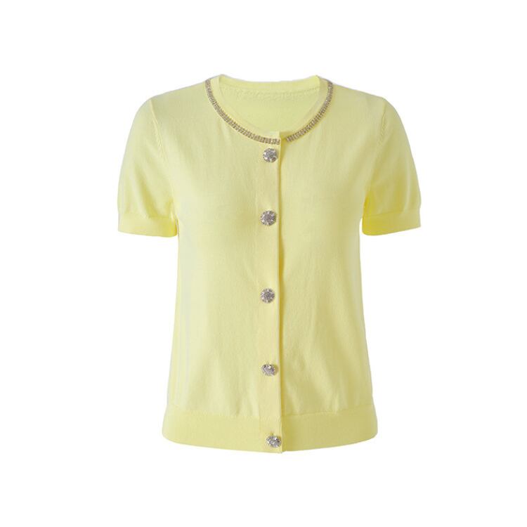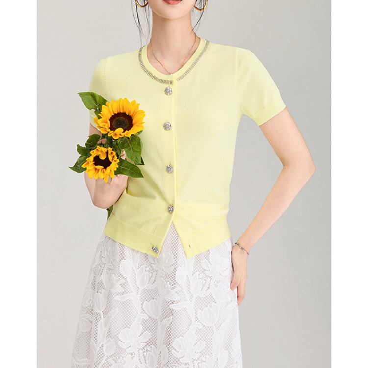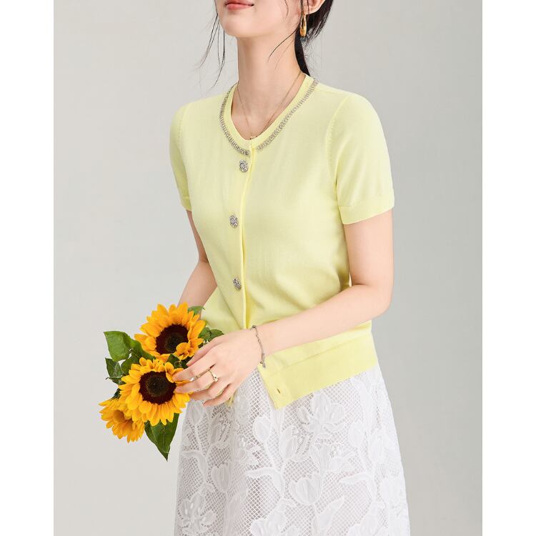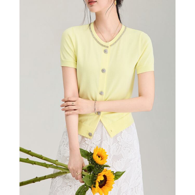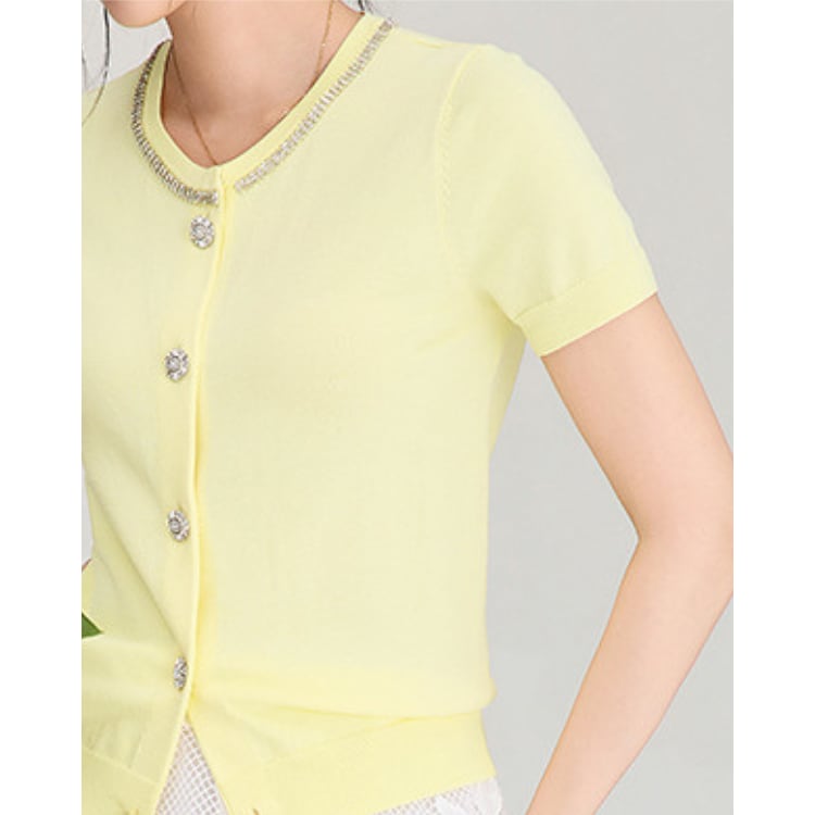 きらめく装飾ボタンとネックラインのディテールが印象的な、半袖ニットカーディガントップスです。トップス感覚でも羽織りとしても使える、着回し力の高いデザインに仕上げています。