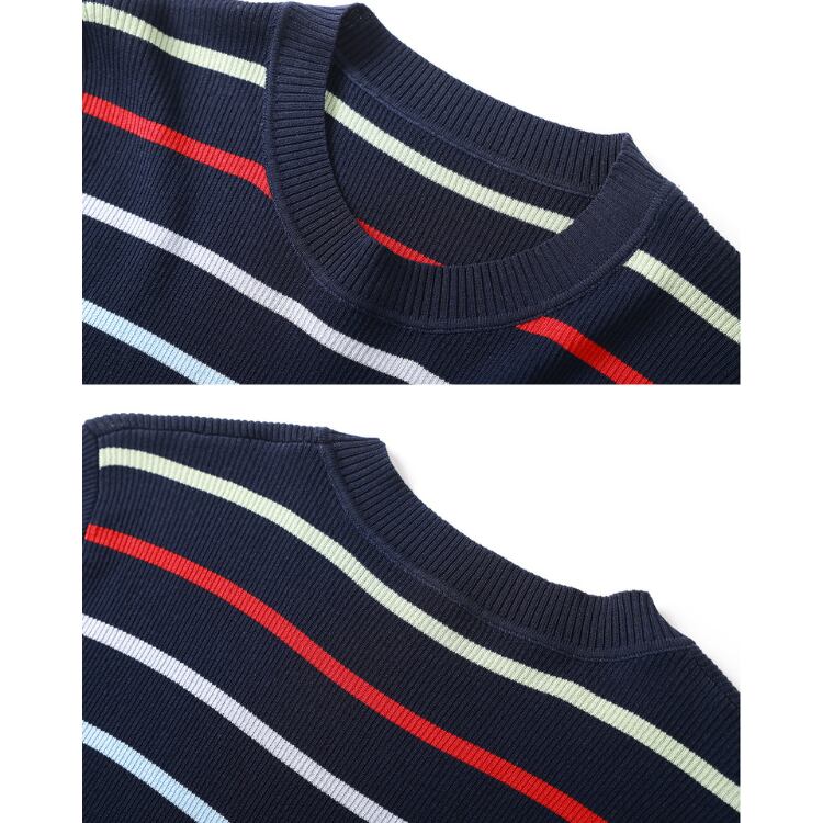 細やかなマルチカラーボーダーが印象的な、半袖ニットTシャツです。シンプルなクルーネックをベースに、繊細な配色ラインを加えることで、程よい遊び心と洗練された雰囲気を両立しています。