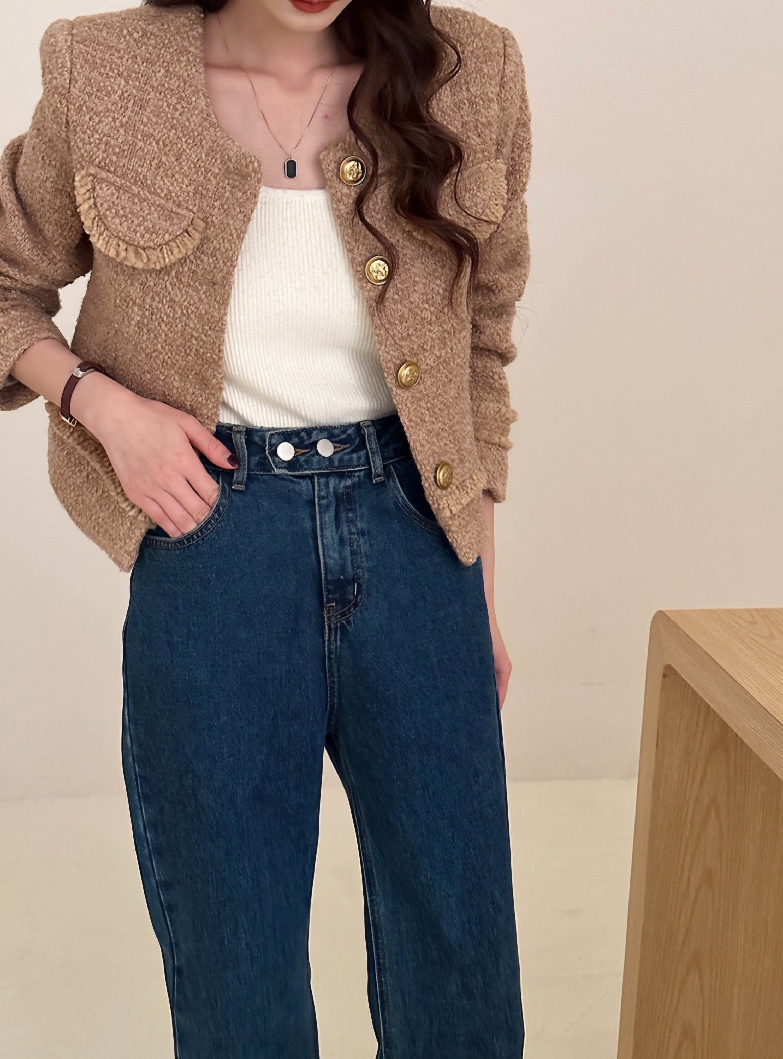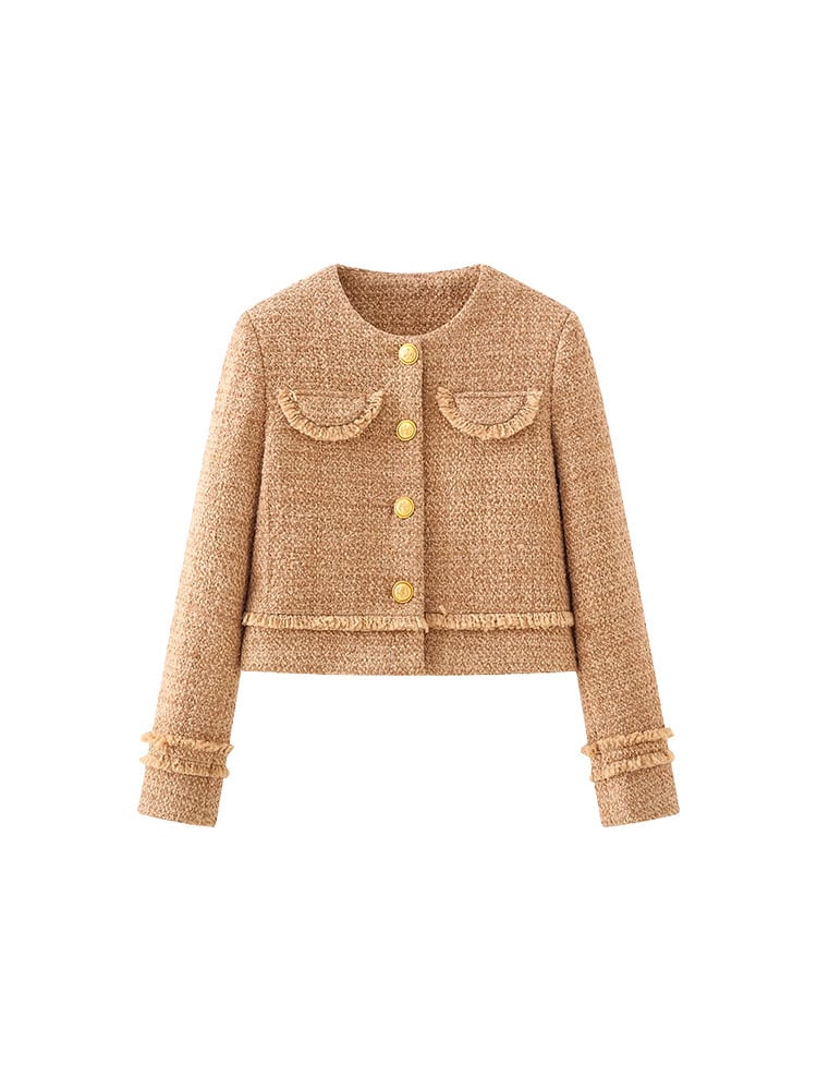 ナチュラルなベージュカラーとゴールドボタンのディテールが魅力です。50%の羊毛と50%のポリエステルを使用し、快適な肌触りと高い保温性を提供します。