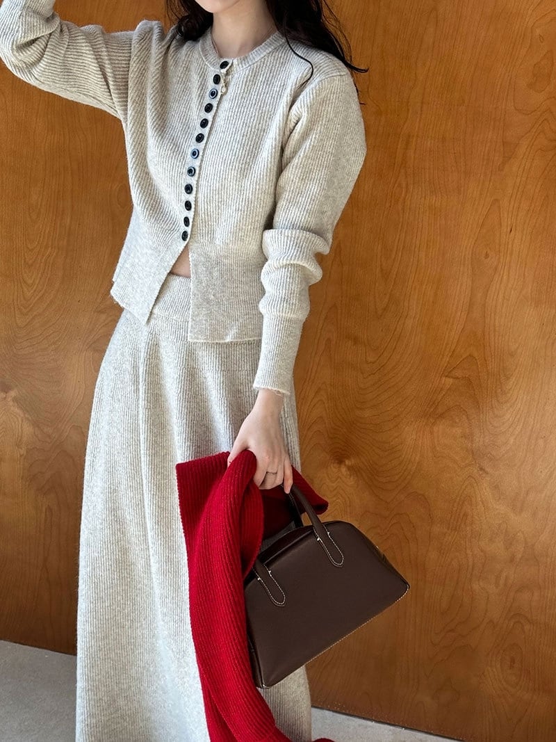 シンプルなデザインが特徴で、どんなスタイルにも合わせやすいアイテムです。ボタン付きのカーディガンと長めのスカートのセットは、カジュアルからフォーマルまで幅広いシーンで活躍します。